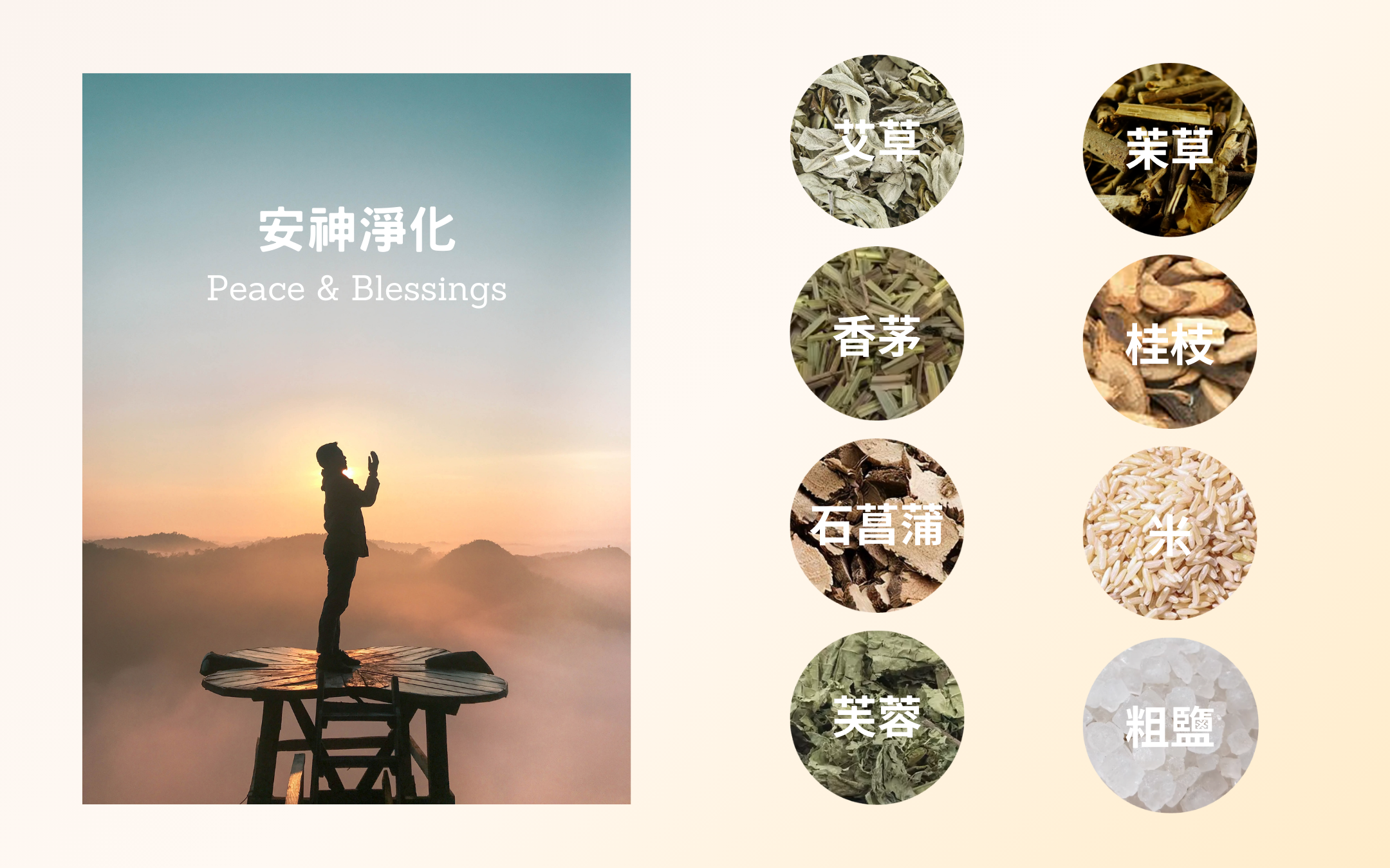 ► 內含:石菖蒲、山芙蓉、桂枝、茉草、艾草、香茅、米、粗鹽