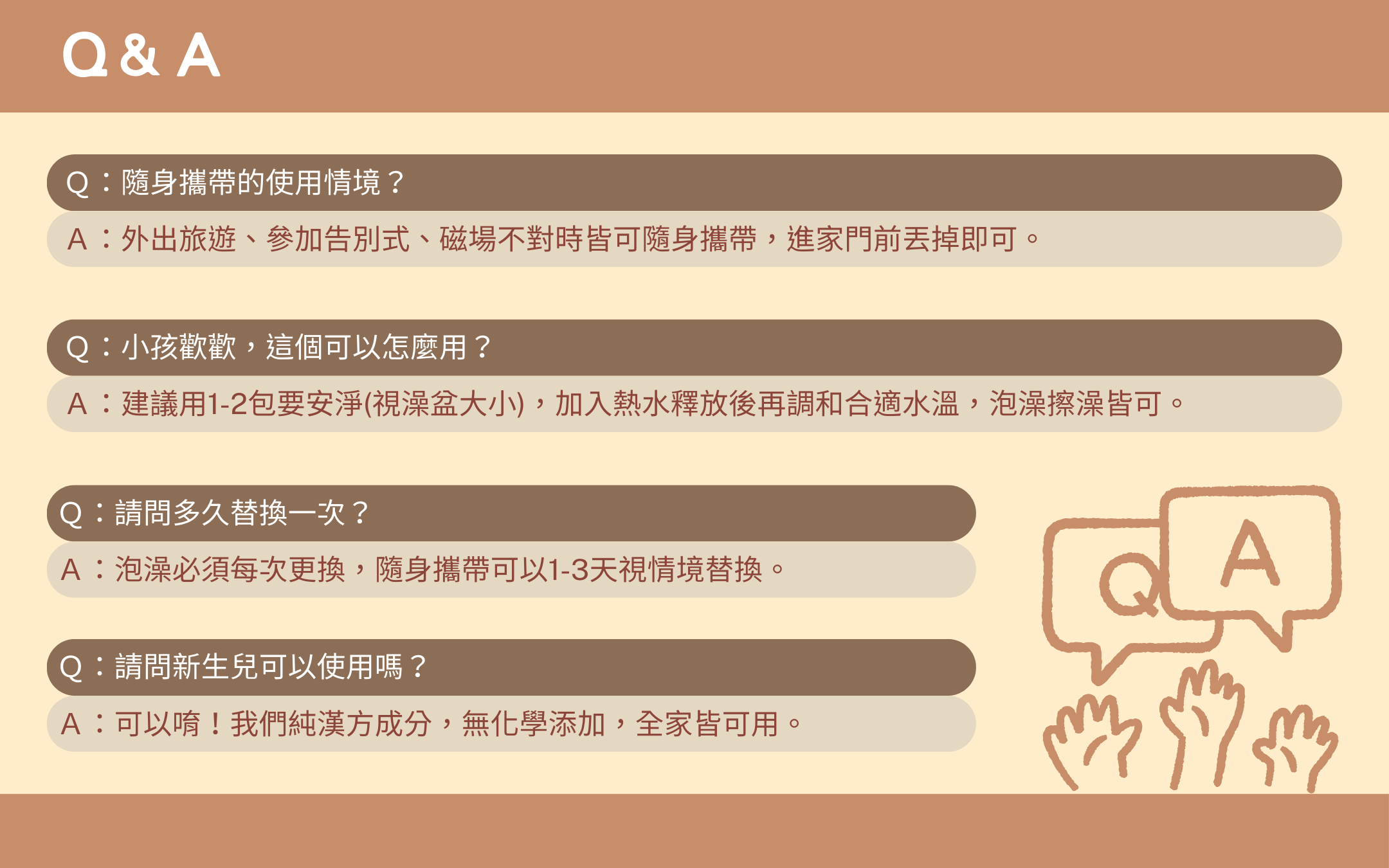●泡澡淨身:使用1-2包要安淨,放入浴缸、臉盆後熱水浸泡、擦拭使用,使用後整包丟掉即可。(建議用量浴缸2包/ 寶寶澡盆1包)